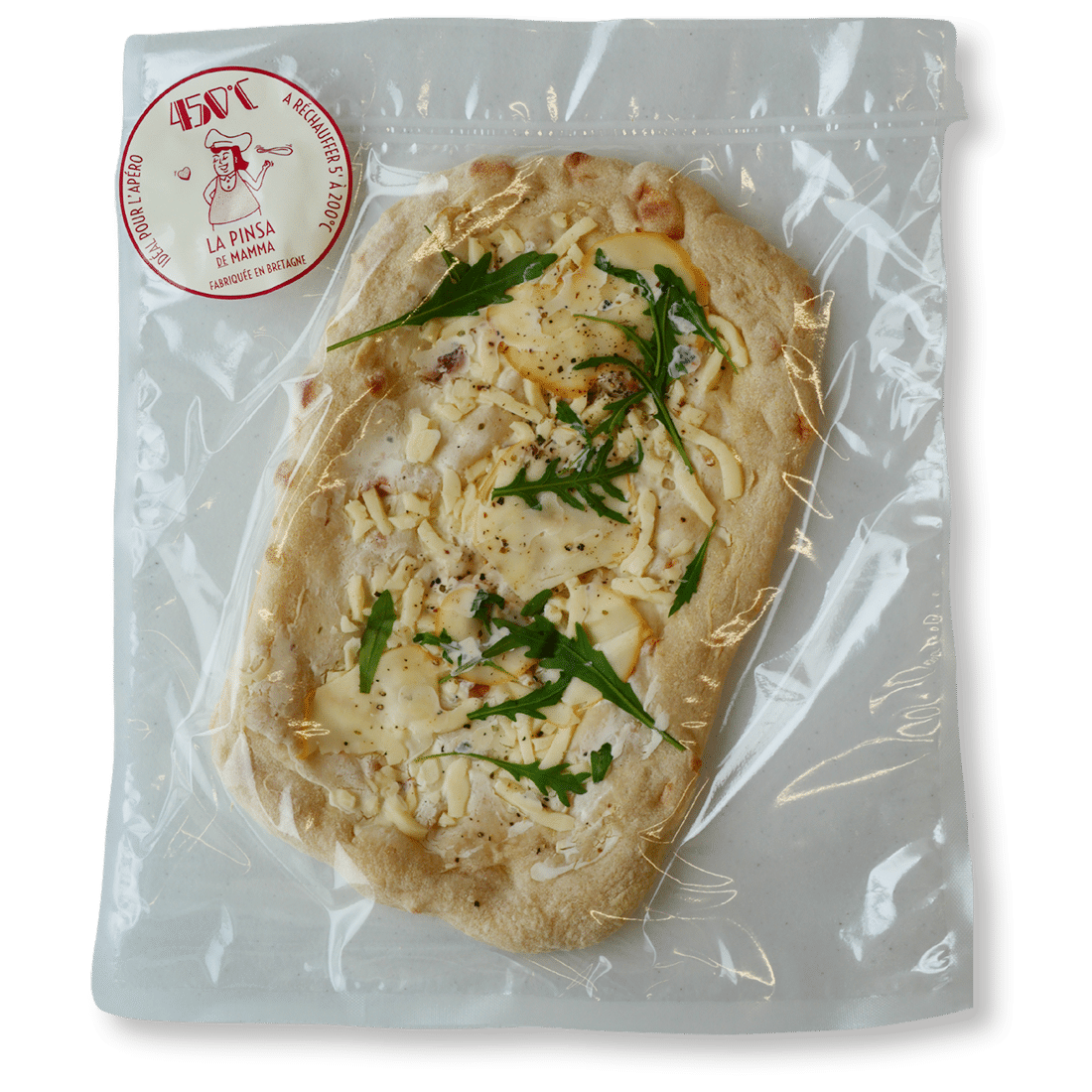 Pâte levée 24h, crème fraîche de Normandie, mozzarella fior di latte, scamorza fumée, gorgonzola DOP, chèvre. Conditionnement sous vide sous atmosphère modifiée.