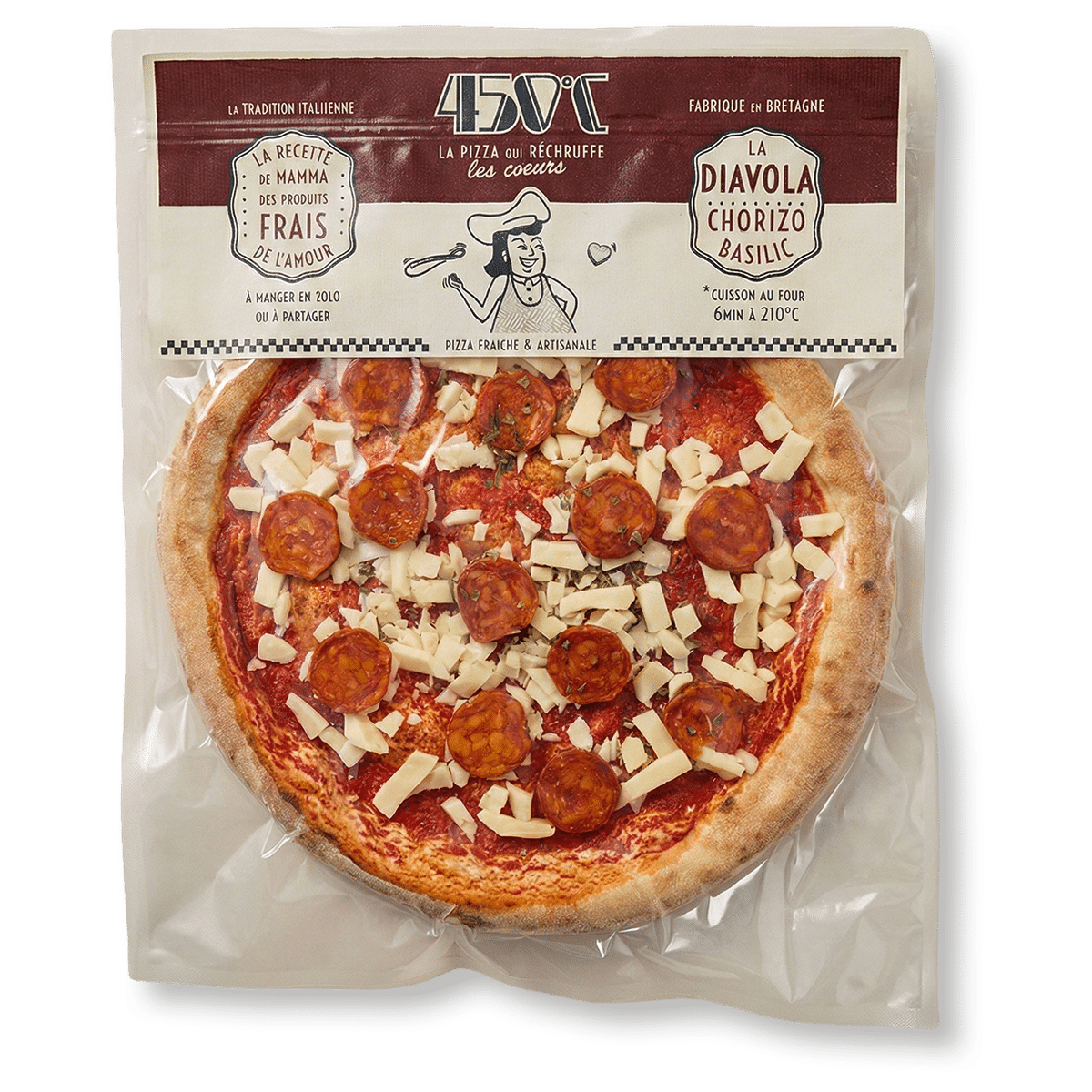 Pâte levée 24h, sauce tomate, chorizo, basilic. Conditionnement sous vide sous atmosphère modifiée.